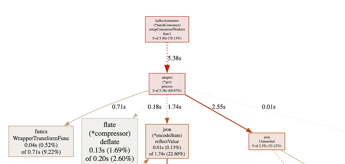 • Вместо encoding/json воспользовались библиотекой bytedance/sonic для сериализации и десериализации объектов размером ~1,50 Кб. Локальный нагрузочный тест на 100 тыс. сообщений Kafka, результаты pprof от 2,55 сек. до 0,68 сек.: