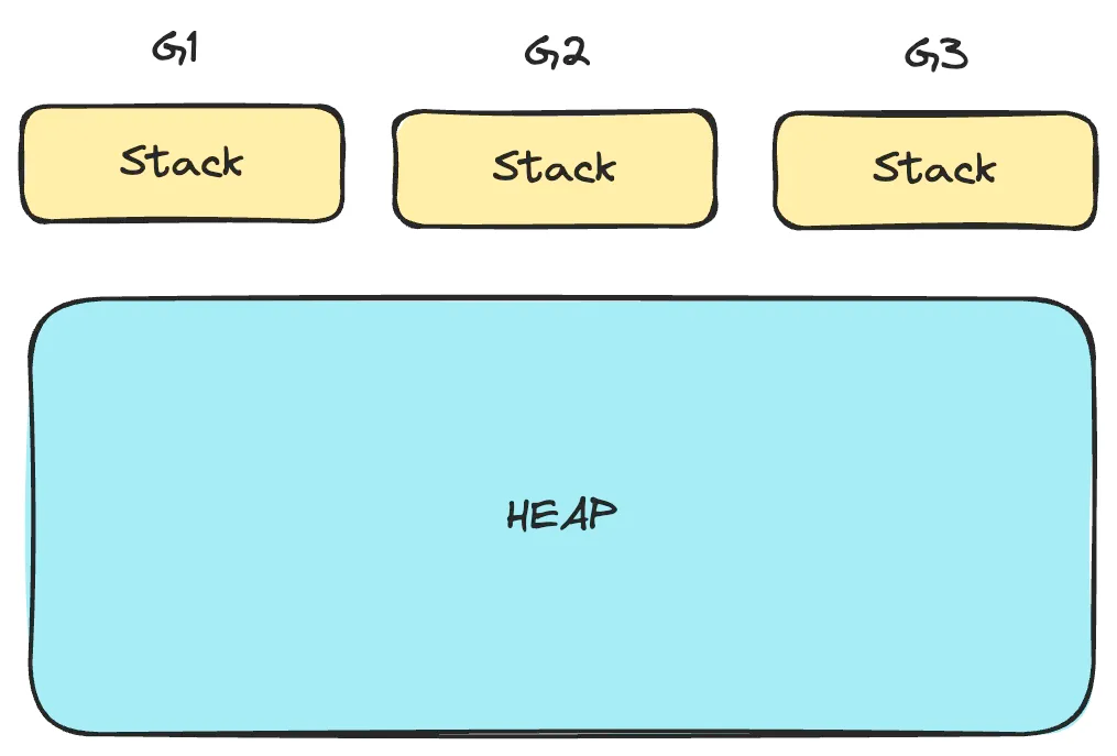 На Go выделение памяти осуществляется либо в стеке, либо в куче. У каждой горутины имеется собственный стек, этот непрерывный блок памяти. Куча же  —  это большая область общей памяти, доступная всем горутинам. Проиллюстрируем это схемой:
