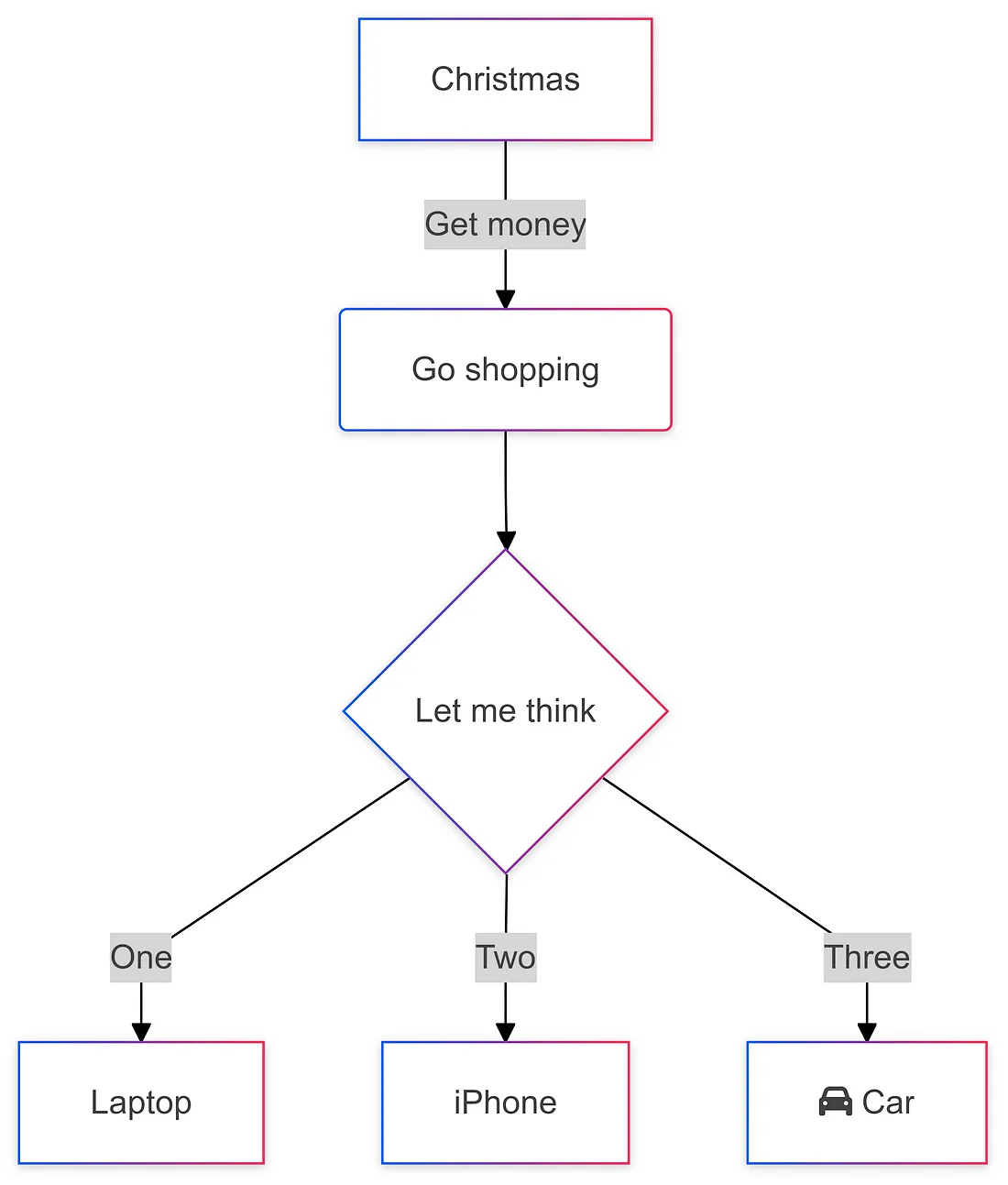 A[Christmas] -->|Get money| B(Go shopping)