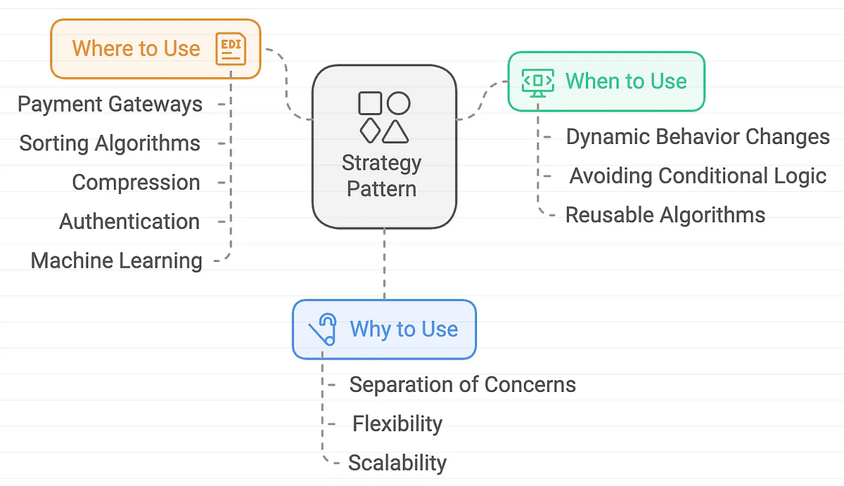 Благодаря определению общего интерфейса для стратегий, созданию конкретных реализаций для каждого алгоритма и управлению их выполнением с помощью класса контекста, шаблоном «Стратегия» обеспечиваются четкое разделение обязанностей, повышенная тестопригодность и более легкая масштабируемость. Он активно применяется в таких сценариях, как обработка платежей, сортировка, сжатие и системы аутентификации. Более того, с этим шаблоном также используется отношение has-a.