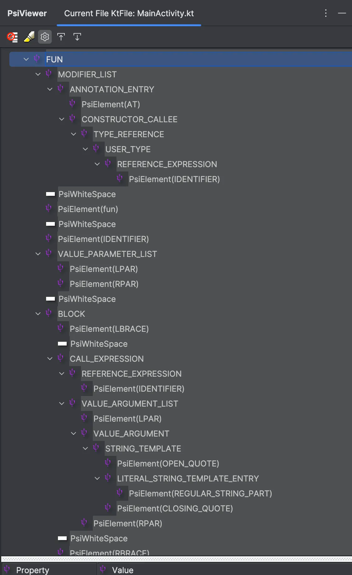 Для определения корректных правил Compose относительно высокоуровневых объявлений, членов класса и локальных объявлений внутри  —  функций, значений и т. д.  —  в ComposableDeclarationChecker применяется аналогичный подход с рассмотрением PSI и его свойств. Например, в Compose желательно убедиться, что функции main случайно не помечены как тип Composable: