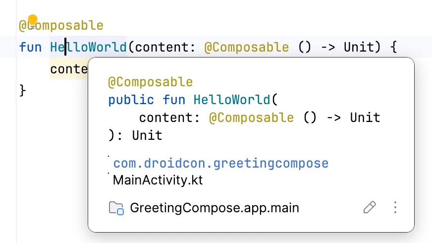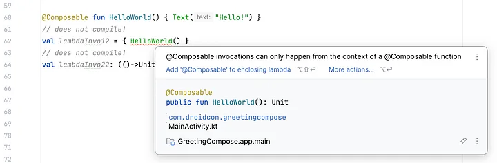 Стоит отметить, что в список диагностических предупреждений/ошибок добавляется ComposeDiagnosticSupressor. Так минуются языковые ограничения, которые в противном случае чреваты сбоем компиляции в Kotlin. Вот, например, возможность аннотировать @Composable для вызова функциями высшего порядка другой Composable: