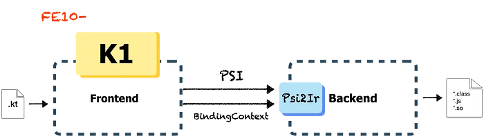 Начнем с общей архитектуры компилятора Kotlin, а подробнее  —  с фронтенда компилятора. Здесь имеется две текущие версии: новый фронтенд и старый. Возьмем новый, называемый FIR-фронтендом, то есть промежуточным представлением фронтенда, или компилятором k2. Вот он схематично: