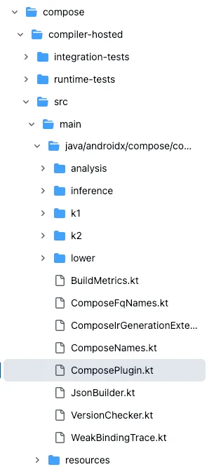 Плагин компилятора Compose перемещен из Androidx в репозиторий Kotlin. Открыв файловую систему и перейдя к исходному коду, обнаруживаем такие файлы и папки: