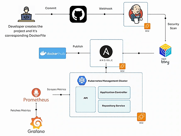 - Автоматизация и безопасность: в Jenkins автоматизируется процесс сборки, выполняется проверка безопасности с Aqua Trivy и образ Docker отправляется в Docker Hub. Так перед развертыванием обеспечивается соблюдение всеми контейнерами стандартов безопасности.