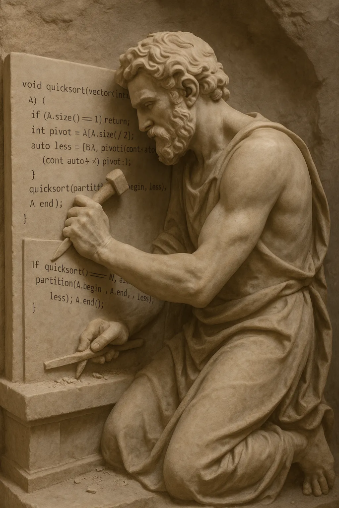 Когда я впервые увидел, как работает быстрая сортировка, я был потрясен. В ней было что-то почти поэтическое. Горстка строк, в которых ощущался идеальный баланс — никакой избыточности, ничего лишнего. Каждая инструкция служила цели, каждая строка имела вес. Это был не просто алгоритм; это была композиция. И чем больше я сравнивал его с другими методами сортировки, которые были медленнее, тяжеловеснее и затратнее в плане времени или памяти, тем больше восхищался его чистотой.