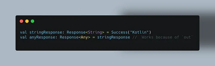 В данном случае Response<out T> означает ковариантность — можно безопасно присвоить Response<String> переменной типа Response<Any>.