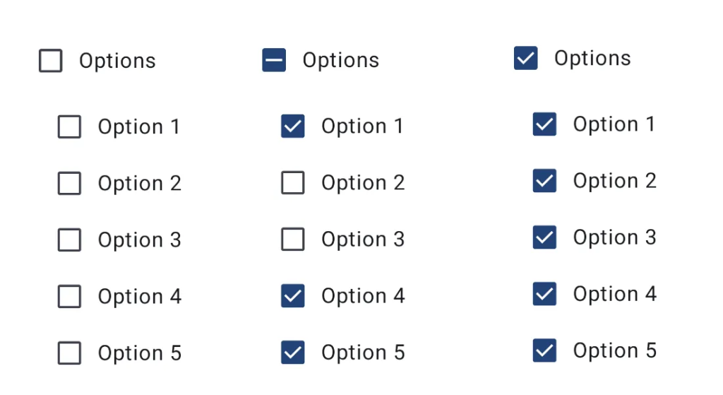 Вот как мы можем реализовать описанный выше выбор. Еще одна важная особенность заключается в том, что щелчок по TriStateCheckbox изменяет состояние всех дочерних флажков.