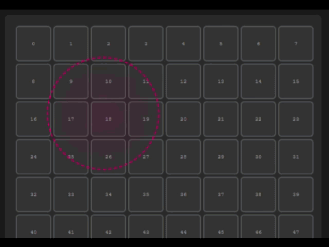 Мой первоначальный подход был довольно простым и прямолинейным. Представьте себе сетку карт 10 × 10, каждая из которых имеет идентичный радиальный градиент. К элементу-контейнеру сетки привязано событие mousemove, которое обновляет позицию градиента для всех карт, используя свойства offsetX и offsetY объекта события при каждом его срабатывании. Учтя несколько подводных камней со свойствами смещения события, получаем радиальный градиент, который, казалось бы, отслеживает курсор мыши, тем самым подсвечивая ближайшие карты на своем пути — словно прожектор, преследующий курсор по всему полю. Отсюда и название — градиентный прожектор.