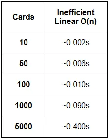 - Неэффективная версия (O(n)): Производительность ухудшается пропорционально количеству карт. Увеличение с 10 до 5000 карт приводит к ухудшению производительности в 200 раз (0,002 с → 0,400 с).