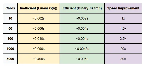 Переломный момент наступает примерно при 50 картах — ниже этого порога издержки бинарного поиска делают наивный подход немного быстрее. Но стоит перейти к крупномасштабному использованию с сотнями или тысячами элементов, как оптимизированная версия начинает работать экспоненциально лучше.