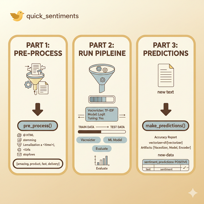 Хотели бы запускать полный сквозной анализ тональности — от исходного текста до готового прогноза — всего в три простых шага? Именно для решения этой задачи я создал свой новый Python-пакет quick_sentiments. Он берёт на себя все сложные и трудоемкие задачи по очистке текста, векторизации и машинному обучению «под капотом», позволяя вам сосредоточиться на результатах, а не на шаблонном коде.