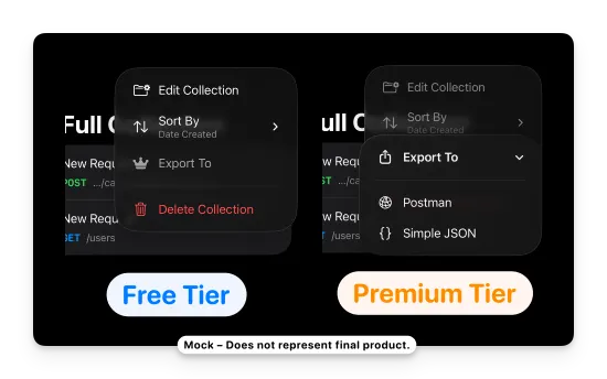 Меню в API Canvas, позволяющее экспортировать коллекцию или запрос в JSON, на отображается как «👑 Экспорт в…» для пользователей, находящихся на бесплатном уровне. Это сразу указывает на премиум-статус функции. Нажатие на нее ведет к предложению о подписке, а после обновления тарифа функция отображается как «🔼 Экспортировать в…». Если разделить пользователей на категории: 1) те, кому функция не нужна; 2) те, кому она нужна, но только бесплатно; 3) те, кто готов за нее заплатить, — платный доступ увидят только пользователи из третьей группы.