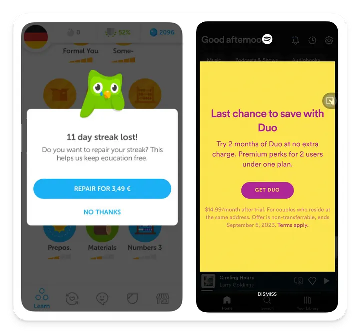 Мы можем наблюдать за этим в режиме реального времени. Пользователи Duolingo жалуются на необходимость платить за «восстановление» прерванных серий; сообщество Spotify полно сообщений с жалобами на навязчивые всплывающие окна с предложением подписки Duo, даже после неоднократных его отклонений. К сожалению, подобные тактики работают — иначе эти компании бы прекратили их использовать. Данные Duolingo подтверждают это: A/B-тестирование показывает, что эти тактики увеличивают конверсию. Поэтому, когда вы видите конверсию в 5% и знаете, что баннер «предложение с ограниченным сроком действия» поднимет ее намного выше поставленной цели в 8%… легко найти себе оправдание. Только в этот раз. Только небольшой толчок.