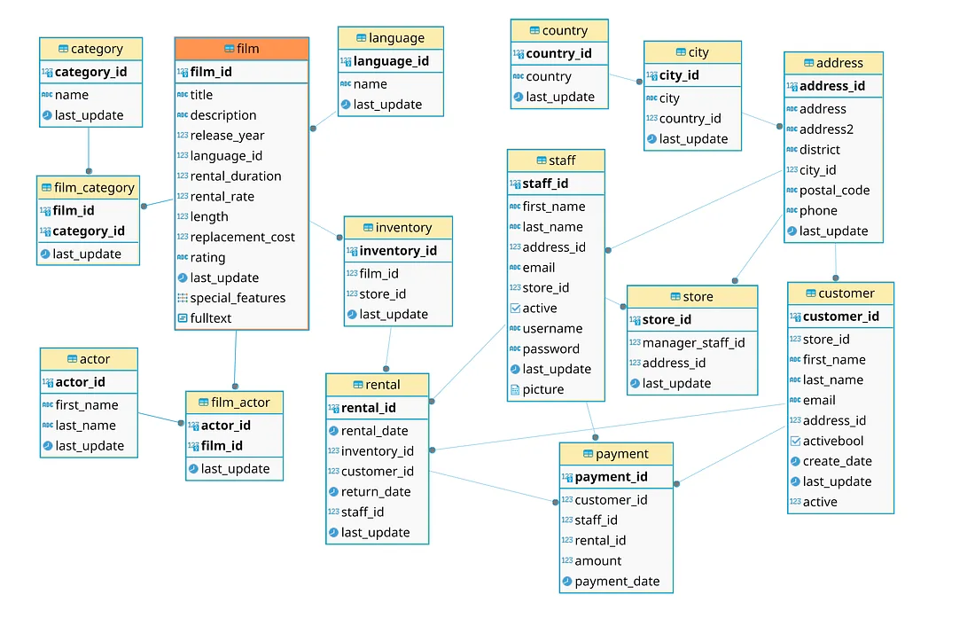 Вот немного переупорядоченная модель данных dvdrental, посмотрите, нет ли пропусков, поделайте запросы в таблицы источников, обнаруживая странности: