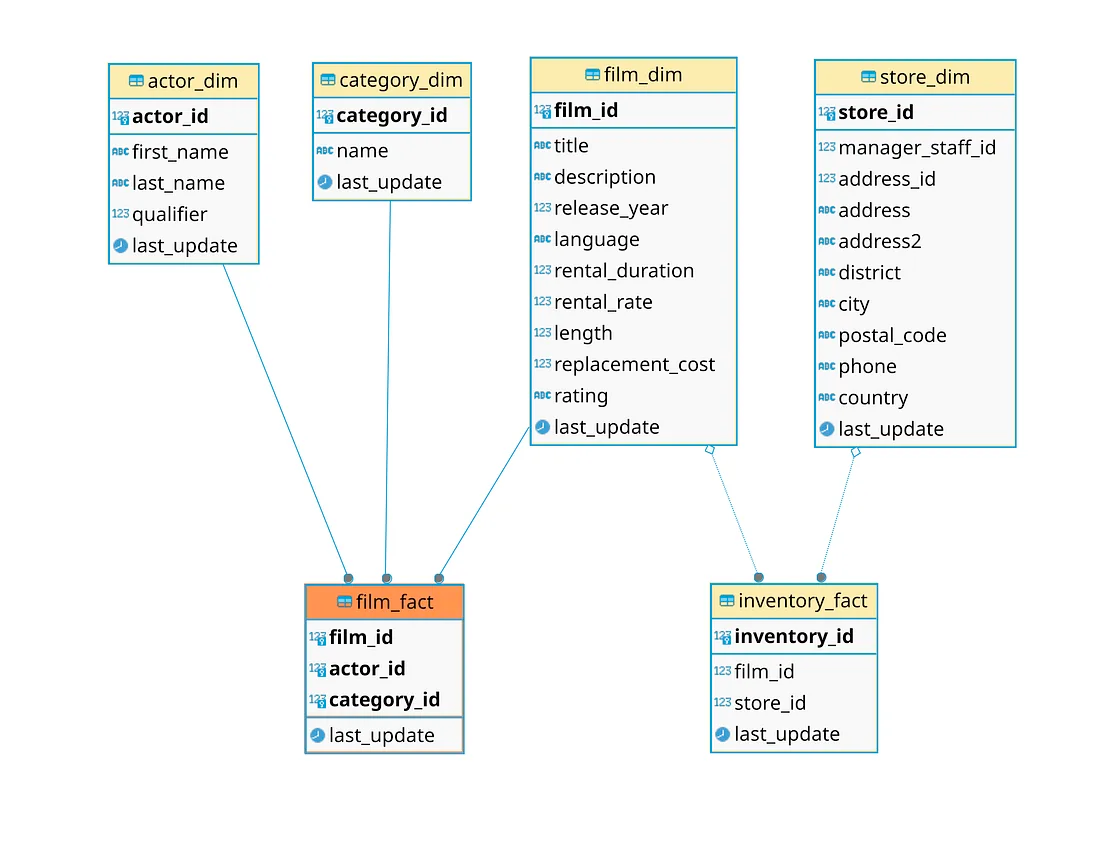 Возьмем подмножество таблиц источника: film, inventory, store, category, а также film_category, actor и film_actor. Четыре таблицы измерения: category_dim, actor_dim, film_dim, store_dim и две таблицы фактов: film_fact, на самом деле это таблица-мост, и inventory_fact.