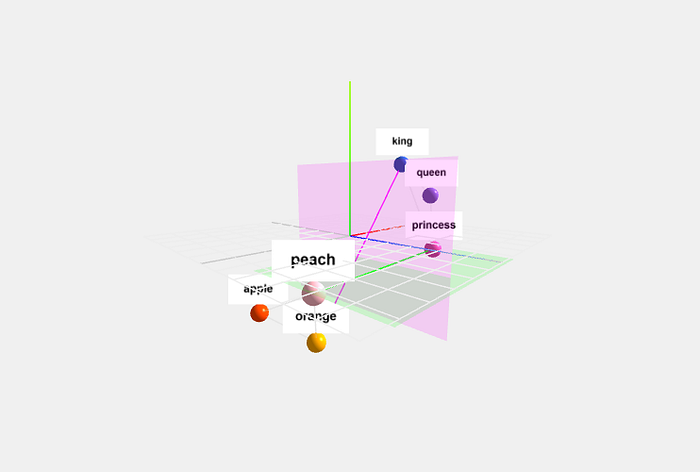 На этой диаграмме показано взаимное расположение в векторном пространстве слов «king» (король), «queen» (королева), «princess» (принцесса), «apple» (яблоко), «orange» (апельсин) и «peach» (персик). Обратите внимание, что первые три слова образуют собственный кластер «королевской семьи», а последние три — кластер «фруктов». Тем не менее, существует по меньшей мере одно измерение — зеленая плоскость, — которое связывает «princess» и «peach», поскольку эти слова связаны по смыслу как минимум в одном контексте: компьютерная игра Super Mario Bros., в которой есть персонаж Princess Peach (Принцесса Персик). А слова «king» и «orange» соединены розовой линией, которая символизирует историческую личность — короля Вильгельма III Оранского (king William of Orange).