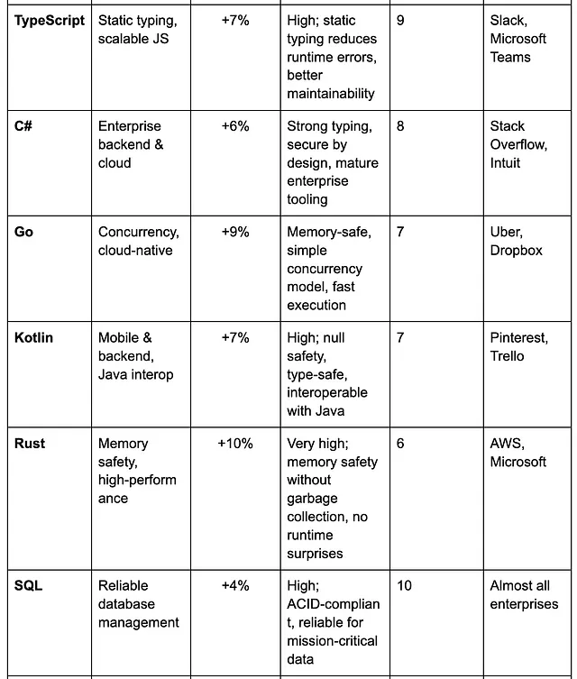 C# остаётся мощным языком для создания корпоративного ПО благодаря бесшовной интеграции с экосистемой .NET. Он быстр, безопасен и идеально подходит для создания всего — от веб-приложений до облачных сервисов и десктоп-инструментов. Благодаря постоянной поддержке со стороны Microsoft, C# стабильно входит в топ-10 наиболее используемых языков, согласно Stack Overflow Developer Survey 2025. Неудивительно, что ему доверяют миллионы специалистов, разрабатывающих производительные корпоративные решения.