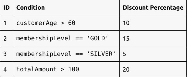 Возьмем приложение электронной коммерции, в котором применяются скидки на основе критериев вроде возраста клиента и статуса его членства. Эти критерии будут храниться в базе данных и динамически оцениваться языком выражений Spring для определения применимых скидок.