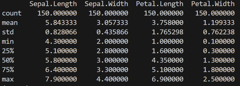 Здесь выводятся среднее арифметическое, стандартное отклонение, минимальное и максимальное значения, а также квартили для каждого числового столбца в наборе данных.