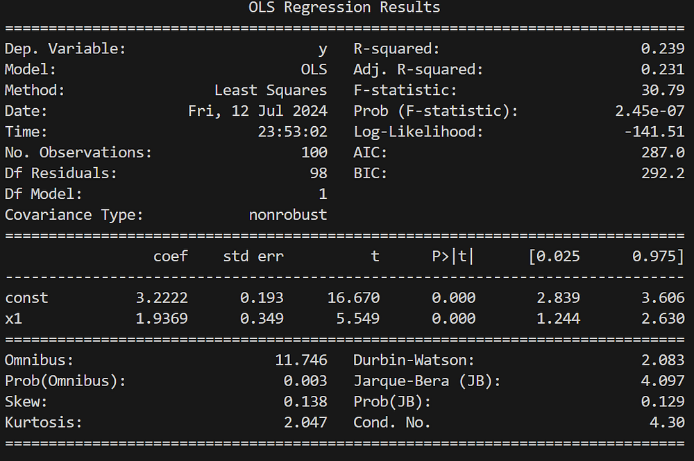 В этом примере генерируются синтетические данные, осуществляется подгонка простой линейной регрессионной модели со statsmodels, выводится сводка результатов регрессии. Функцией sm.add_constant(X) в матрицу предикторов добавляется свободный член, что важно для подгонки свободного коэффициента регрессионной модели.