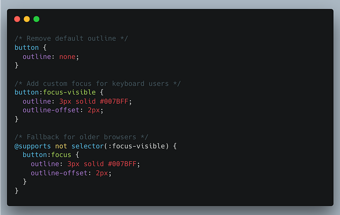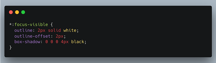 Псевдокласс :focus-visible революционизирует подход к управлению состояниями фокуса. Браузеры больше не отображают визуальный индикатор фокуса (например, рисуя «кольцо фокуса») вокруг каждого элемента при его получении. Вместо этого они используют набор эвристик для показа индикатора фокуса только в тех случаях, когда это наиболее полезно для пользователя.