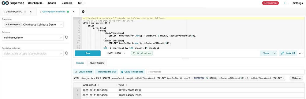 Инфраструктура готова, переходим к аналитике. Для набора данных криптоопераций создадим дашборд с 5-минутками средневзвешенной по объему стоимости за последние 24 часа.