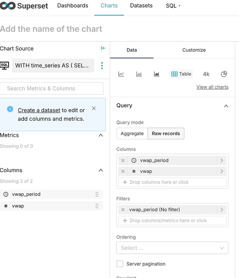 Сначала добавим набор данных Superset с тиковыми данными. Создаем его из таблицы в базе данных и делаем из этого диаграмму или же в SQL Lab пишем запрос и после строим диаграмму из него. Выбираем второй подход: