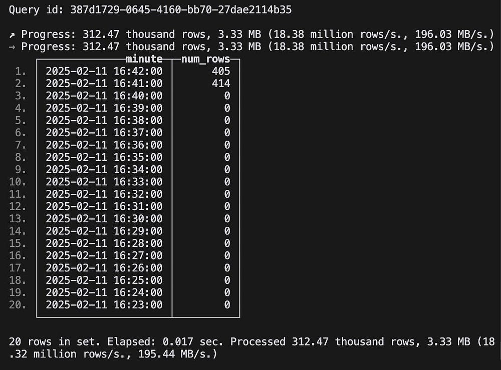 Сначала для хранения числа операций в минуту создаем в клиенте Clickhouse таблицу:
