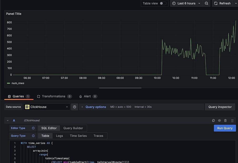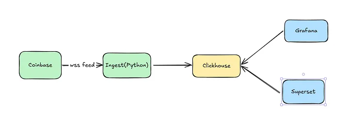 Ключевым словом TO материализованному представлению здесь приказывается обновить таблицу числа операций в минуту. Оператором select выдается запрос для получения входящих данных из источника, в данном случае таблицы тиков Coinbase, в которой хранятся необработанные данные.